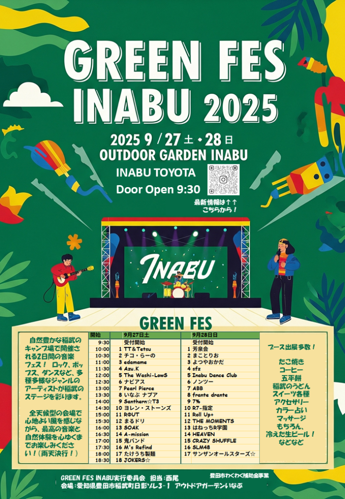 9月27日(土)、28日(日)の2日間、アウトドアガーデンいなぶにて「GREEN FES INABU 2025」が開催されます。