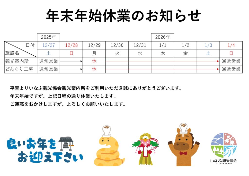 2025.12.22 年末年始休業のお知らせ いなぶ観光協会観光案内所、どんぐり工房の年末年始休業のお知らせです。 よろしくお願いいたします。 関連情報 2024.12.21 雪み街道いなぶ 開催のご案内 MORE 2024.02.22 いなぶ旧暦のひな祭り2024 開催のご案内 MORE 2025.06.09 はじめてのわくわくキャンプのお知らせ MORE 2025.08.21 【終了】花道家小川珊鶴先生によるイベントのご案内 MORE 一覧に戻る
