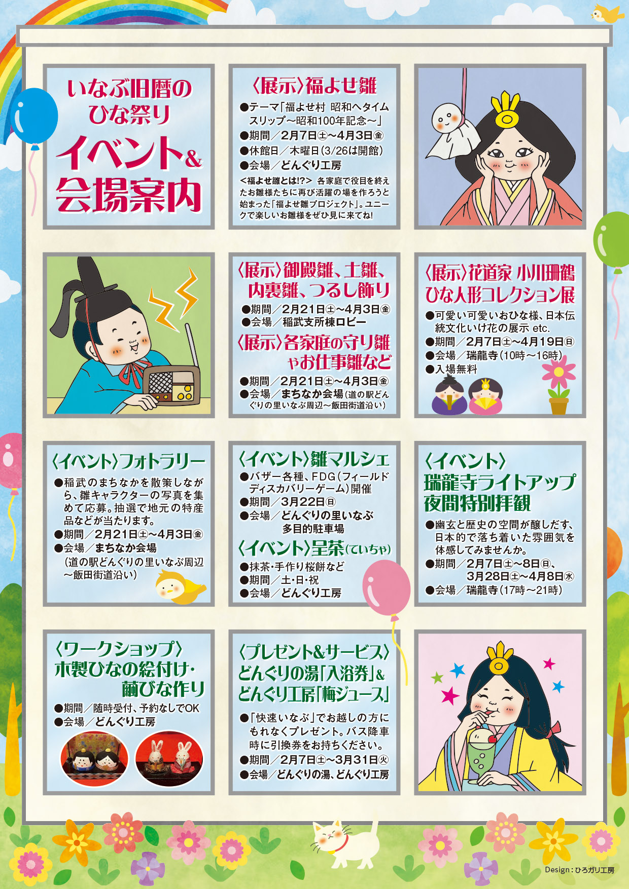 2026.01.15 いなぶ旧暦のひな祭り2026 開催のご案内 いなぶ旧暦のひな祭り2026開催のご案内です。 今年のテーマは「福よせ村 昭和へタイムスリップ~昭和100年記念~」です! 【開催期間】 2026年2月7日(土)~4月3日(金) 【会場】 道の駅「どんぐりの里いなぶ」周辺~飯田街道沿い 【お問合せ】 どんぐり工房 0565-83-3838 是非お越しください! 関連情報 2021.11.30 どんぐり通信12月号が発行されました! MORE 2025.07.22 【終了】シャワークライミングのご案内 MORE 2025.04.15 お米づくり体験 in いなぶ2025のご案内 MORE 2025.12.22 【終了】夏焼城ヶ山元旦登山2026 MORE 一覧に戻る