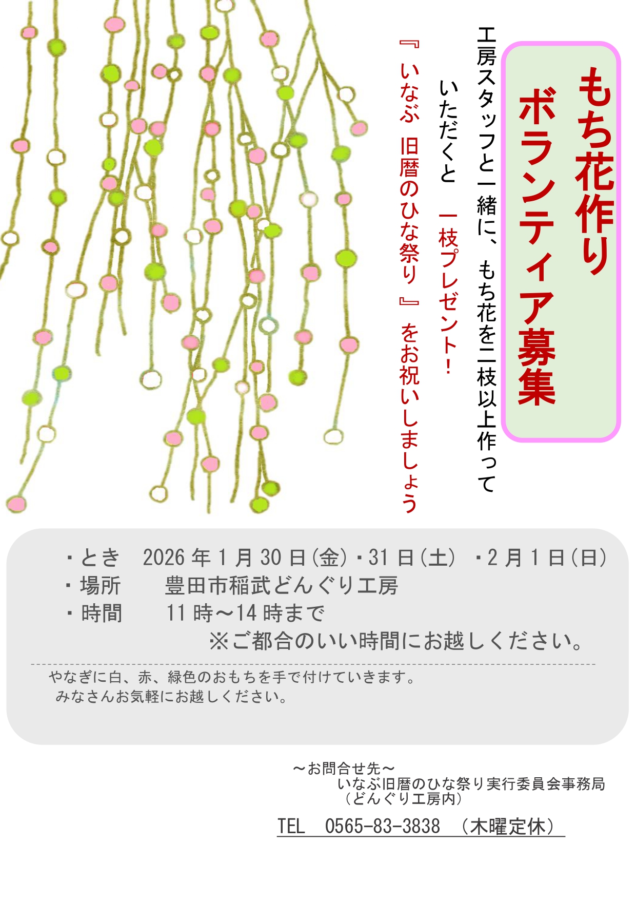2026.01.28 もち花づくりボランティア募集のお知らせ いなぶ旧暦のひな祭りでまちなかを彩る『餅花』を 作ってくださる方を募集! どんぐり工房のスタッフと一緒に餅花を2枝以上作っていただくと、1枝プレゼント! 1月30日(金)、31日(土)、2月1日(日) 11:00〜14:00の間でご都合の良い時間にどんぐり工房までお越しください! 無料・予約不要です! 関連情報 2023.05.17 OGI GREEN FES.2023のご案内 MORE 2025.10.15 【終了】第15回 タカドヤ湿地もみじまつり 開催のご案内 MORE 2023.02.20 いなぶ旧暦のひな祭り2023 ひなキャラフォトラリーのお知らせ MORE 2023.10.25 第1回大野瀬もみじまつり 開催のご案内 MORE 一覧に戻る