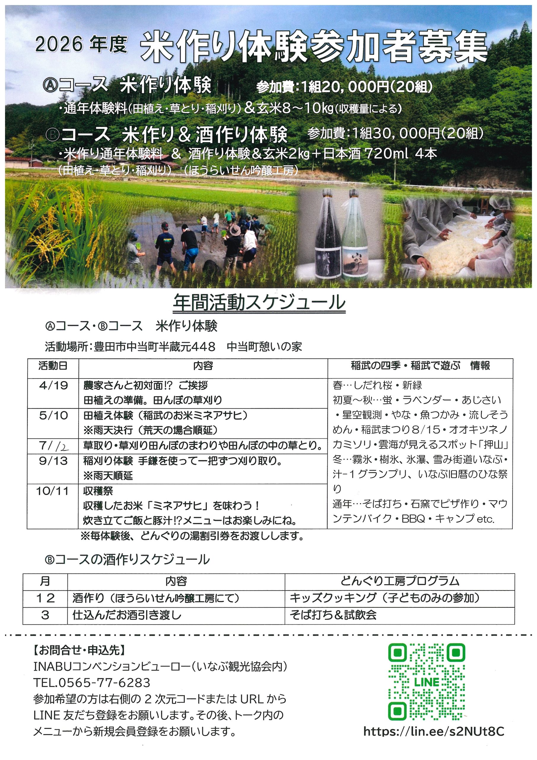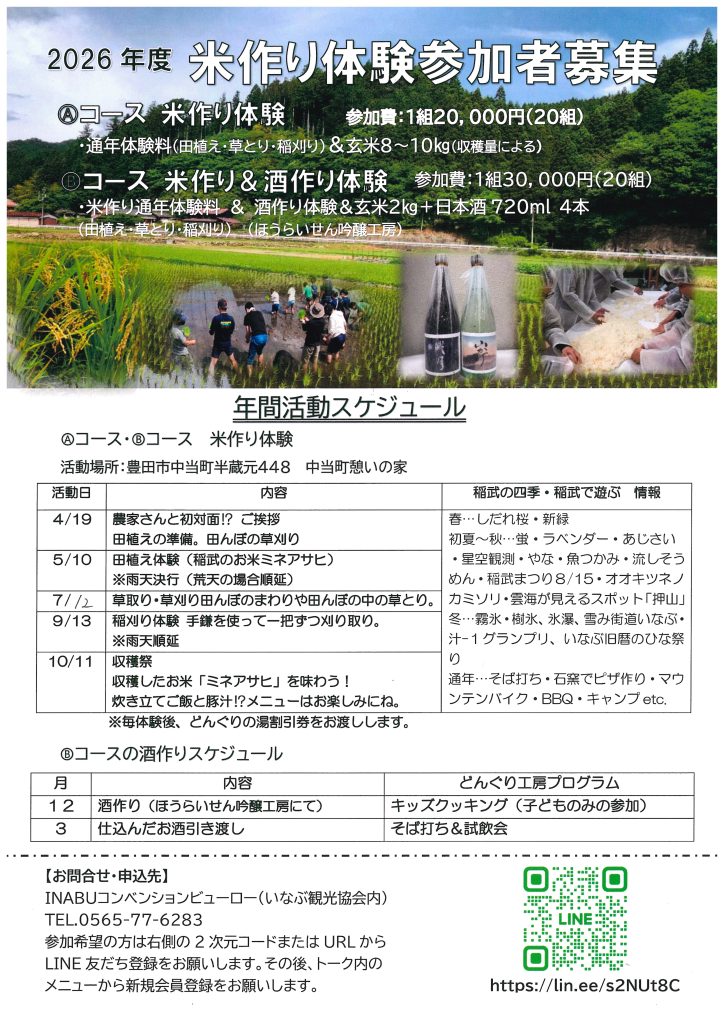 2026.02.12 お米とお酒づくり体験いなぶ2026のご案内 稲武の田んぼで米づくり体験してみませんか? 1年を通しての体験となります。 酒づくりの体験も行います。 皆さまのご参加お待ちしております! ※お申込みは先着順とさせていただき、募集定員に達した時点で受付を終了いたします。 何卒ご了承くださいますようお願い申し上げます。 関連情報 2024.09.27 道の駅観光案内所定休日のお知らせ MORE 2023.02.20 いなぶ旧暦のひな祭り2023 ひなキャラフォトラリーのお知らせ MORE 2024.12.21 雪み街道いなぶ 開催のご案内 MORE 2021.12.16 どんぐりの里いなぶより新商品のお知らせ MORE 一覧に戻る