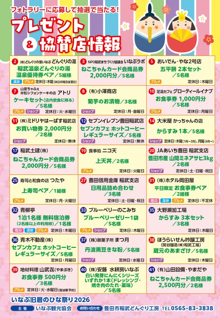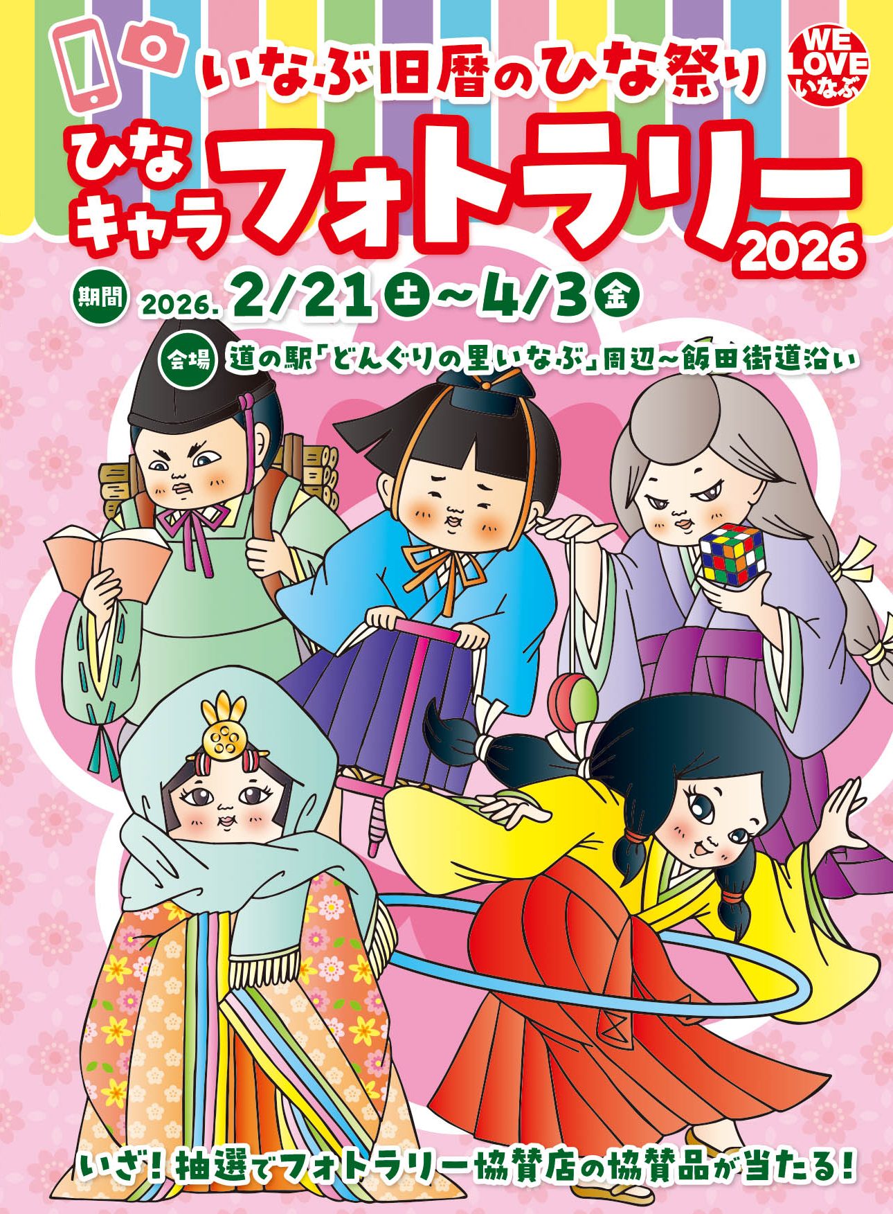 2026.02.12 いなぶ旧暦のひな祭りフォトラリー2026のご案内 2月21日(土)からひなキャラフォトラリーが始まります。 稲武の町中を散策してひなキャラを探してください。 5種類写真を撮って応募。 抽選でプレゼントが当たります! 奮ってご参加ください! 関連情報 2024.04.18 瑞龍寺の端午の節供 開催のご案内 MORE 2025.04.15 【終了】お米づくり体験 in いなぶ2025のご案内 MORE 2024.09.27 道の駅観光案内所定休日のお知らせ MORE 2023.10.18 花道家 小川珊鶴コレクション展、紅葉狩りのご案内 MORE 一覧に戻る